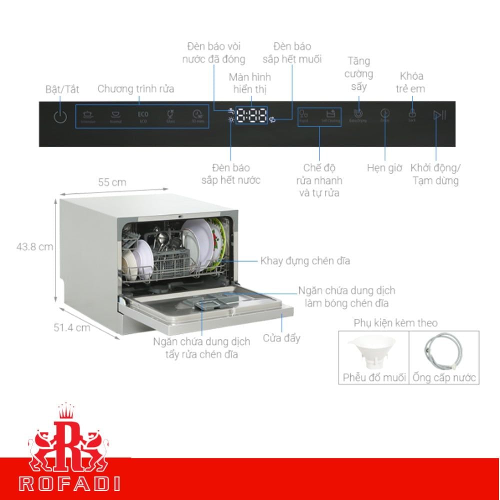 - Máy rửa chén để bàn thiết kế nhỏ gọn, tinh tế nhưng vẫn có đủ các tính năng như 1 máy rửa chén lớn, bao gồm chức năng sấy tăng cường giúp bát đĩa khô ráo hoàn toàn. Bạn sẽ không cần tốn quá nhiều diện tích lưu trữ mà vẫn có 1 sản phẩm tiện lợi trong gian bếp của mình